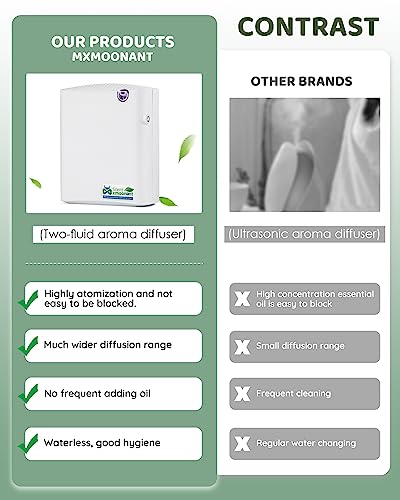 【Meno manutenzione, buona igiene】 La tradizionale diffusione della nebbia ad ultrasuoni utilizza la nebbia come vettore di diffusione, richiede una pulizia frequente per prevenire la crescita batterica nell'acqua. La macchina ad aria profumata Mxmoonant di atomizzazione a due fluidi è senz'acqua, inoltre, con un'elevata atomizzazione, il diffusore non si blocca facilmente e i benefici terapeutici sono ben mantenuti.
