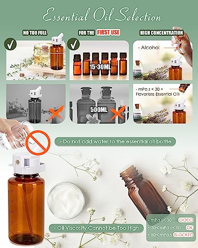 【Scegliere l'olio essenziale giusto】 Questa macchina per oli profumati funziona bene sia con solubili in acqua che solubili in olio. Concentrazioni regolari di oli essenziali sono tutte adatte, ma sono esclusi alcuni oli di concentrazione molto alta;
