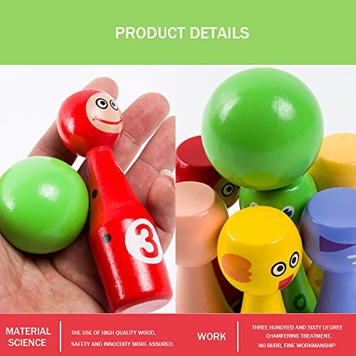13 pezzi set colori bowling giochi, di qualità fine, di buone dimensioni, bella e 10 birilli animali colorati con i numeri di cui 3 palle sfere di legno. Dimensioni Skittle 4(in)x1.1(in).