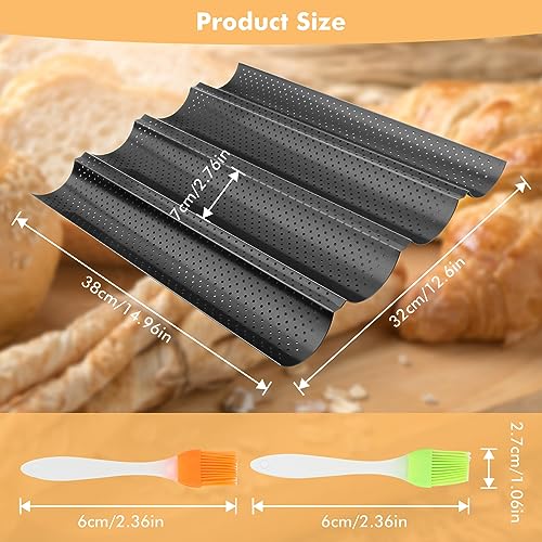 Teglia per Baguette: Riceverete 1 teglia per il pane + 2 spazzole per olio in silicone. Il nostro pane francese bakeware può cuocere fino a 4 baguette contemporaneamente. Dimensioni: 38cm(L) X 32cm(W). Ogni scanalatura di questa teglia per pane è larga 7 cm ed è adatta a tutti i forni. La teglia per baguette è dotata di perforazioni di 2mm che consentono all'aria di circolare liberamente intorno all'impasto, ottenendo un interno soffice e arioso e un esterno croccante e saporito