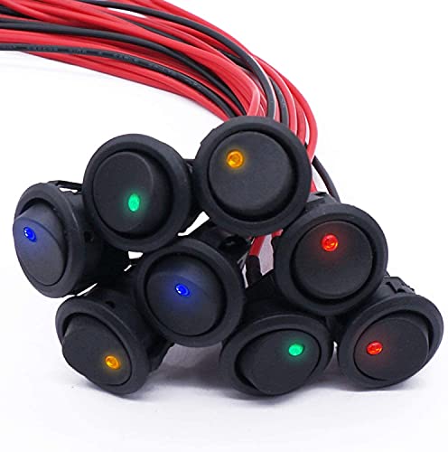 Mxuteuk 8 pezzi SPST interruttore a levetta circolare a bilanciere, utilizzato per auto o nave 20A 12V DC on/off 4 luci LED a colori con fili pre-saldati KCD2-102N-4C-X