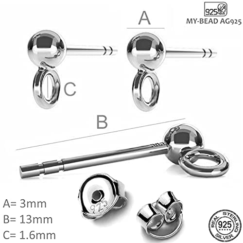 My-Bead 5 Paia Orecchini Perno Argento 925 Senza Nichel con Palla 3mm e Occhiello Alta qualità da gioielliere DIY