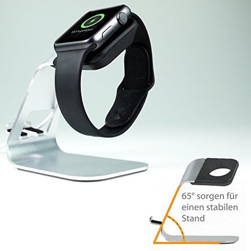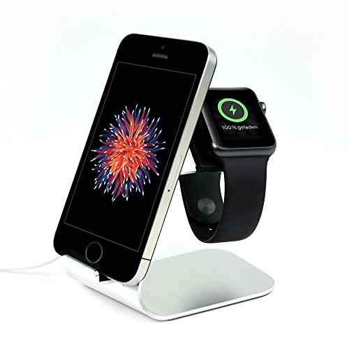 MyGadget Supporto per Apple iWatch 2in1 - Docking Station Alluminio con Gancio per iPhone - Stand per Series 1 & 2 / 42 + 38 mm - Base Argento Metallizzato