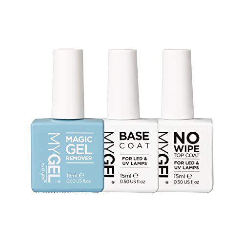 MYGEL by Mylee Set Smalto Semipermanente per Unghie - No Wipe Top Coat + Base Coat + Magic Gel Remover, 3x15ml - UV/LED Nail Art Manicure Pedicure, Uso Professionale e Domestico