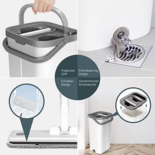 Myiosus Mocio Lavapavimenti e Secchio, Set di Mocio con Secchiello, Mocio con Funzione Strizzante, 140cm Manico Acciaio Inox, 10 Panni in Microfibra Inclusi