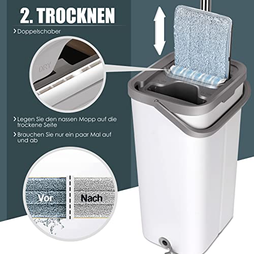Sistema autopulente 2 in 1: il mocio con secchio dispone di un secchio d'acqua a due camere, suddiviso in zona pulita e asciutta. Basta far scorrere la barra del tergicristallo verso l'alto e verso il basso per pulire rapidamente o asciugare senza che le mani entrino in contatto con l'acqua sporca.