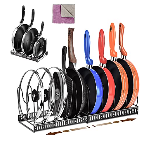 Myiosus Organizer per padelle espandibile, supporto per coperchio con 7 divisori regolabili, per pentole da cucina, armadietti, dispense, 30-58,5 cm di larghezza, nero