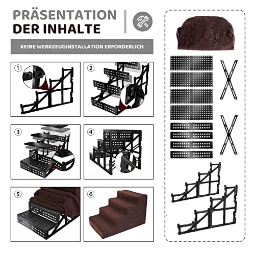 Facile da Montare: Non sono necessari attrezzi, i gradini in plastica possono essere montati con pochi gesti e rivestiti con un morbido rivestimento in tessuto per completare il montaggio. Quando non in uso, le scala cane possono anche essere facilmente smontate e riposte sotto il divano o il letto.