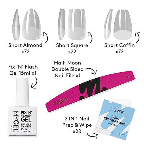 Mylee Fix N Flash Shorts Kit - Set di extension nail tips morbide in gel, 216 pezzi, 3 forme, mandorla, quadrate e ballerina, Include gel, salviette per preparazione e lima per unghie a mezzaluna