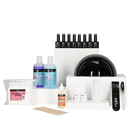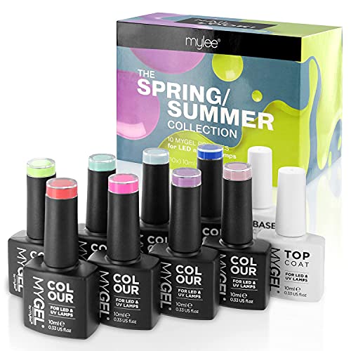 Mylee The Full Works - Set Manicure, 8 smalti per unghie gel semi permanenti MYGEL, top & base coat, Lampada LED Mylee PRO Salon Series, Prep & Wipe, Gel remover (Primavera / Estate - Lampada nera)