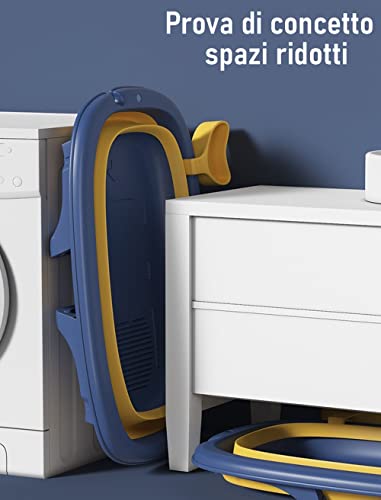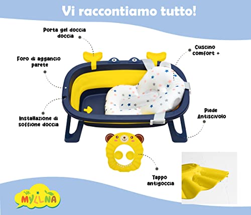 Myllna Vaschetta Bagnetto Neonato Pieghevole 0 A 36 Mesi | Cuscino Riduttore E Tappo Antigoccia Per Shampoo | Piedino Antiscivolo | Facile Da Riporre | Blu