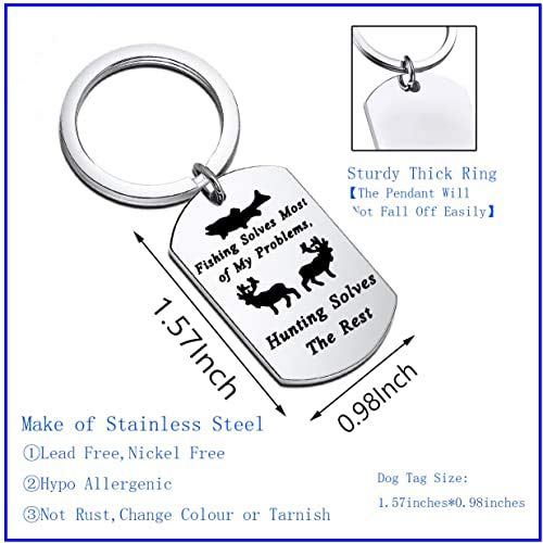 Portachiavi da pesca e caccia: realizzato per gli amanti della caccia e della pesca, questo portachiavi è ben inciso con "La pesca risolve la maggior parte del mio problema, risolve il riposo", divertente portachiavi per gli amanti della pesca e della caccia.