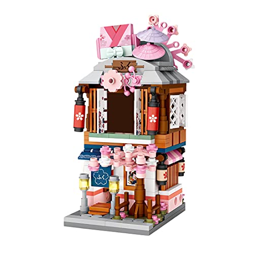 Design raffinato: Ogni elemento del negozio di kimono è rappresentato in un modello di mattoncini in miniatura. L'intero stile di design è squisito, la struttura è stabile e i colori sono brillanti. Davanti al negozio di kimono c'è un enorme albero di ciliegio, lanterne stradali, ecc. e il tetto è pieno di elementi che richiamano il kimono.