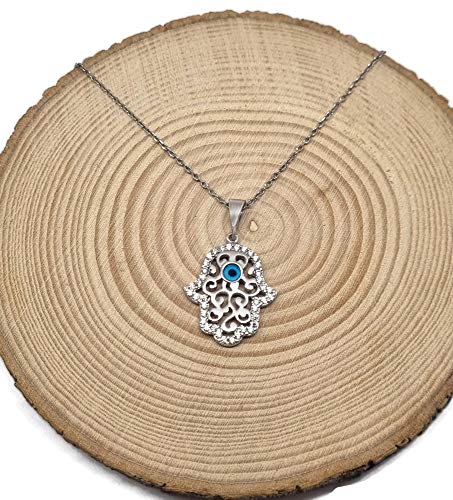 MYSTIC JEWELS By Dalia - Collana con mano di Fatima in argento Sterling 925 con occhio al centro e zirconi intorno, per buona fortuna
