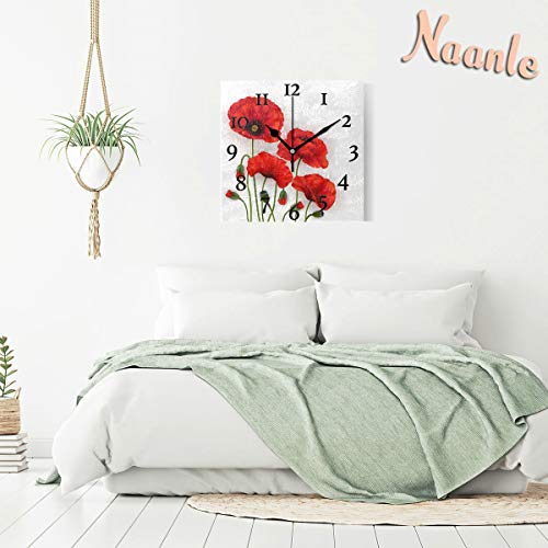 Naanle - Orologio da parete quadrato a forma di papavero, con fiori di papavero, silenzioso, funzionamento a batteria, per casa, ufficio, scuola