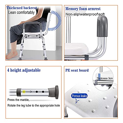 Caratteristiche del sedile da doccia: la sedia da bagno con schienale e braccioli è comoda e morbida, 2) i braccioli con memory foam sono antiscivolo/impermeabile/morbidi, 3) la sedia da bagno può essere regolata in 4 altezze, 4) la seduta è realizzata in materiale PE di 3 cm di spessore, fori porosi per perdite d'acqua, nessun accumulo di acqua