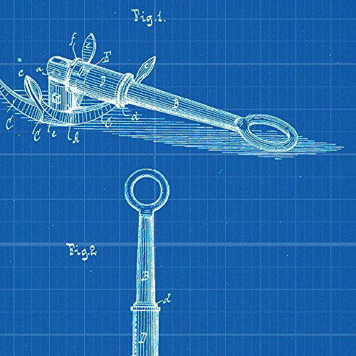 Nacnic set 4 Stampe artistiche sfondo blu brevetto elica, ancora, timone, barca a vela. Manifesti con invenzioni e vecchi brevetti. Sport acquatici ed equipaggiamento tecnico.