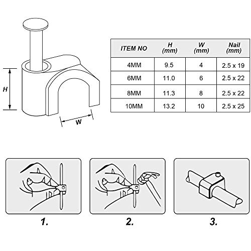 4 & 400: ne forniamo 4 misure di fermacavo con chiodo quali sono 4mm, 6mm, 8mm, 10mm, possono adattare i fili di diverse sezioni, anche puoi unire 2 o 3 cavi insieme e mentendoli in un quello più grande, 400 pezzi in totali.