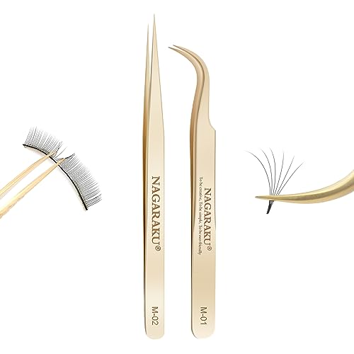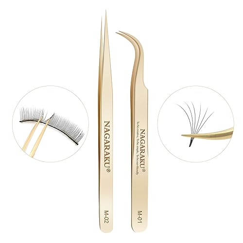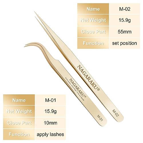 NAGARAKU Pinzetta per Extension Ciglia Professionale in Acciaio Inox Pinzetta di Precisione Curva e Diritta Oro, Faux Lash Tweezers (2 Pcs Pinzette Diritto e Curvo Tip Pinza, M-01 e M-02)