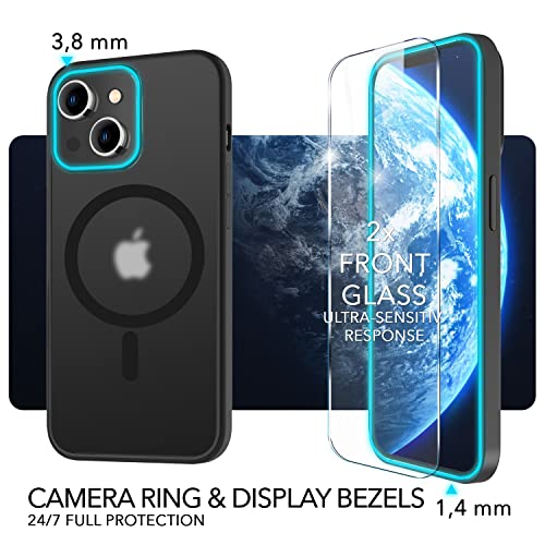 NALIA Set [3-in-1] Cover MagPower Semi-Trasparente compatibile con iPhone 14 Custodia Cellulare Protettiva [compatibile con MagSafe] & 2x Protezione di Schermo Vetro, Caso Ibrido Opaco Telaio Nero