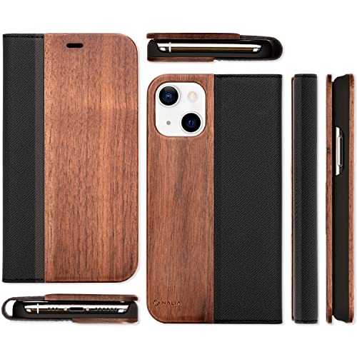 NALIA Flipcover in Vero Legno compatibile con iPhone 13 Mini Custodia, FSC cert. Wood Flipcase Naturale con Funzione di Supporto & Slot per Carte, Protezione Completo Resistente Guscio Rigida - Noce