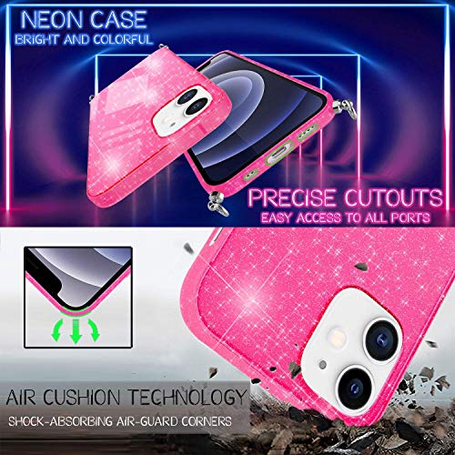 NALIA Neon Glitter Cover con Cordino compatibile con iPhone 12 Mini Custodia, Trasparente Brillantini Silicone Case & Girocollo, Traslucido Bling Copertura Resistente Skin, Colore:Rosa Glitter