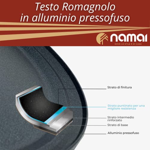 NAMAI Padella Antiaderente 28 cm - Padella Induzione - Manico Removibile Salva Spazio - Testo Romagnolo Originale - Alluminio - Padella Crepes - Padella per Piadina- Padella Crepes Induzione