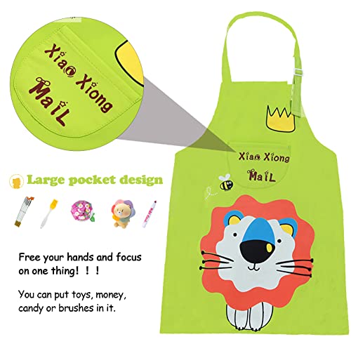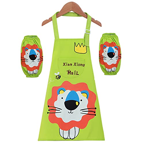 【Il pacchetto perfetto】: 1 × grembiule per bambini con il leone verde e 1 paio di maniche per proteggere meglio i vestiti e le braccia del tuo bambino da tutti i tipi di macchie. Adatto a bambini tra 100-145cm/39-57in, lunghezza dell'indumento: 63cm/24.8in.