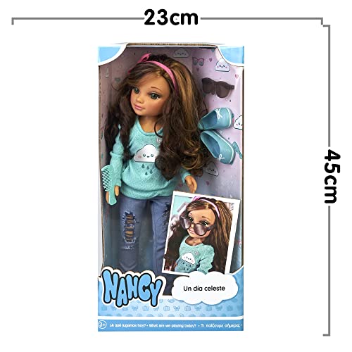 Nancy - Un Giorno Celeste | Bambola dai capelli scuri con vestiti celesti e accessori alla moda, per bambine e bambini dai 3 anni