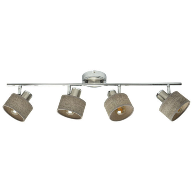 Schermo con quattro faretti della serie NANDO in colore CROMO/NIQUEL con sfumature GRIGIO LEGNO. Realizzata in metallo e tessuto con quattro portalampada E14. Lampadine non incluse. Dal design molto originale e moderno, i suoi faretti possono essere articolati verticalmente e con una rotazione dell'asse orizzontale di quasi 360°, permettendo così di indirizzare la luce verso qualsiasi punto della stanza. Il colore e la trama dei suoi schermi, che simulano il legno, lo rendono adatto a decorazioni naturali e rustiche, sebbene sia anche molto in linea con stili di decorazione minimalista e vintage. Ha dimensioni di 16x73x10 centimetri. In questa serie troviamo le strisce abbinate a quattro, tre e due luci, il faretto a una luce e la plafoniera a tre luci.