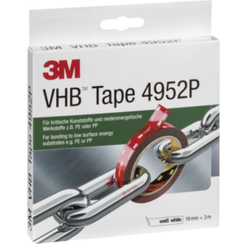 VHB ™ Short Roll 4952 P Nastro ad alte prestazioni a doppio lato per uso interno ed esterno • Applicazione: per materiali critici e materiali a bassa energia (PE/ PP) • Esecuzione: solventi elevati e resistenti alle intemperie su superfici ruvide. Da richiedere.