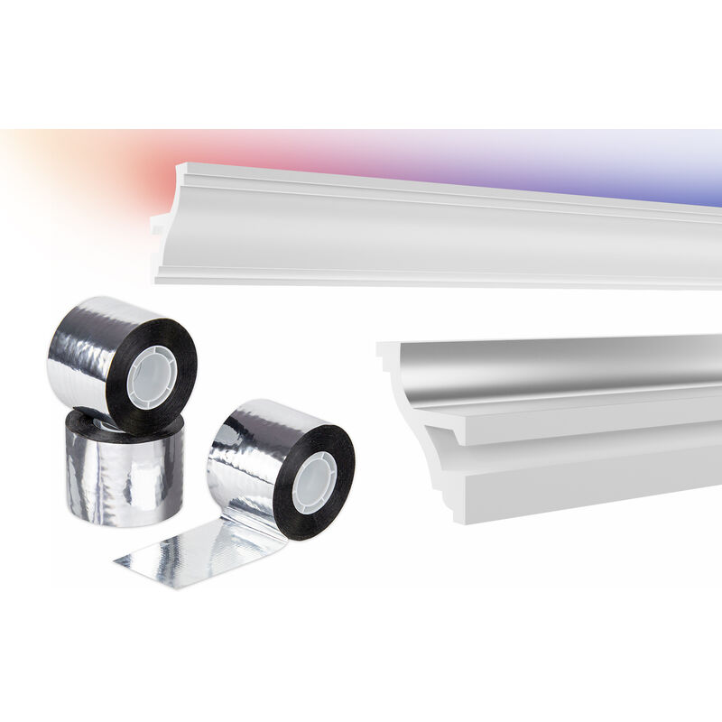 10 metri di nastro riflettente autoadesivo in alluminio per profili LED in stucco (min. 4 metri di nastro necessari per una striscia 2m), Dimensioni: 20 x 1 mm, Colore: argento, Materiale: alluminio Impedisce alle strisce LED di brillare attraverso - Il nastro riflettente in alluminio impedisce alle strisce LED di brillare attraverso le strisce di stucco LED. Aggiunta perfetta - Grazie alla superficie liscia dell'alluminio e alla sua capacità di riflettere la luce, il nastro riflettente è ideale per migliorare l'aspetto generale. Nastro di alluminio complementare per profili di stucco LED unici. Il nostro nastro riflettente in alluminio autoadesivo è il complemento perfetto per i nostri profili di stucco LED in EPS, XPS e HDPS. L'illuminazione indiretta sta diventando sempre più popolare nei salotti e nelle camere da letto tedesche. Pertanto, per garantire il miglior aspetto visivo, vengono utilizzate le nostre strisce di alluminio. Grazie alla sua capacità di riflettere la luce e