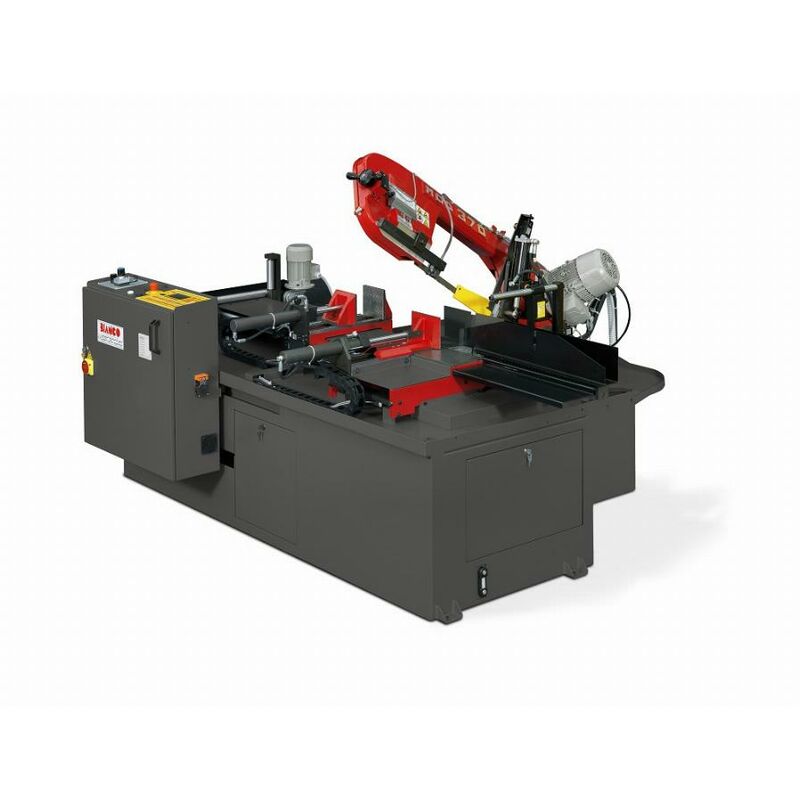 Dettagli: Sega a nastro CNC automatica Taglio a 60° a destra mediante rotazione dell'arco, avanzamento barra 800 mm con corsa (10'000 max) Pannello di controllo con programmatore CNC, possibilità di realizzare lunghezze diverse nella stessa barra con lo stesso programma di taglio Caratteristiche: Dati tecnici Volt del motore: 400 kW del motore: 0,9/1,5 Dimensioni nastro mm: 3120 x 27 x 0,90 Velocità del nastro m/min: 35 e 70 Corsa di avanzamento della barra: 600 mm Altezza di lavoro: 835 mm Regolazione della lunghezza con lettura del display a 1/10 mm Ripetizione dell'avanzamento della barra 9 volte Sensore di presenza del pezzo Peso: 945 kg