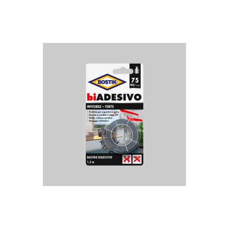 Nastro biadesivo trasparente extra forte, ideale per un fissaggio definitivo, sicuro ed invisibile di insegne, oggetti decorativi, ganci, termometri e molto altro. Perfetto su superfici lisce, in ambienti interni ed esterni. Adatto anche per la zona doccia. Resistente ai raggi UV, alle temperature e all'acqua. Nastro biadesivo 'invisibile' bostik mm 19x1,5mt BOSTIK Nastri imballo e adesivi