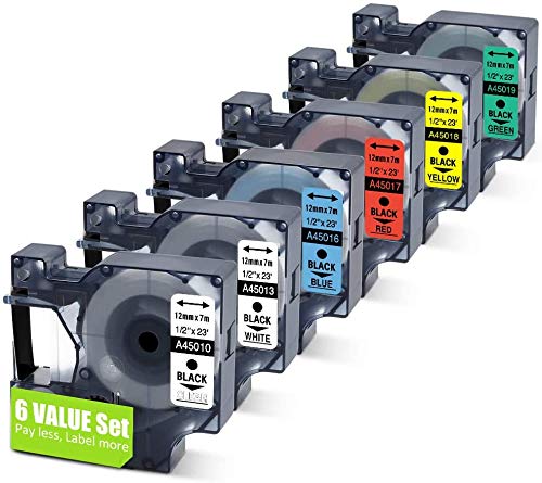 Dymo D1, 6 Nastro Cassette Compatible con Dymo D1 Nastri 45010/45013/45016/45017/45018/45019, 12mm x 7m, per DYMO LabelManager 160 360D Rhino 4200 5200