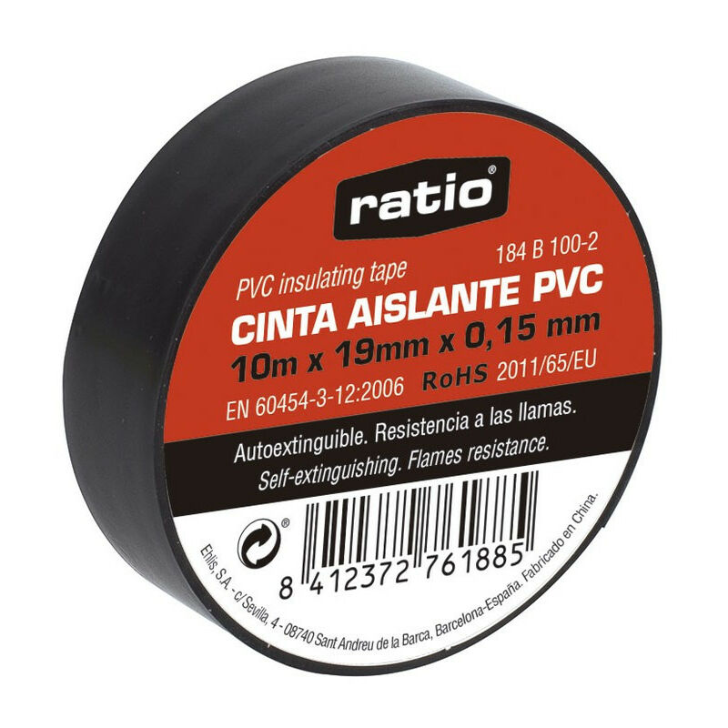 Caratteristiche tecniche: PVC. Spessore 0,15 mm .. Autoestinguente. Resistenza alla fiamma. Norma EN 60454-3-12: 2006. Direttiva RoHs 20011 / 65EU. 10 mx 19 mm .. Nero.
