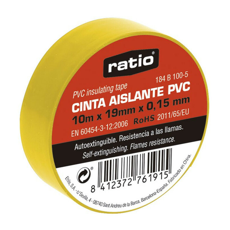 Caratteristiche tecniche: PVC. Spessore 0,15 mm .. Autoestinguente. Resistenza alla fiamma. Norma EN 60454-3-12: 2006. Direttiva RoHs 20011 / 65EU. 10 mx 19 mm .. Giallo.