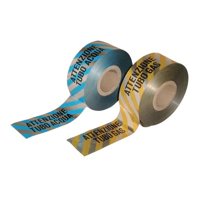 Caratteristiche tecniche: Materiale: alluminio anodizzato Rivestimento: PP trasparente H: 80 mm Spessore: 121 µm Nastri in alluminio anodizzato con stampa indelebile protetto da pellicola trasparente in plastica resistente all'invecchiamento e alle basse temperature. Indispensabile per la localizzazione dei tubi acqua e gas interrati. Rilevabile con metal e radio detector. Rotolo da 200 metri. Fornibile anche con rete