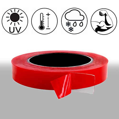 Nastro biadesivo ad alte prestazioni: composto da una massa adesiva acrilica altamente trasparente, estensibile, resistente ai raggi UV, senza supporto (come copertura è una pellicola rossa in PP), rotolo da 5 m, spessore 0,5 mm.