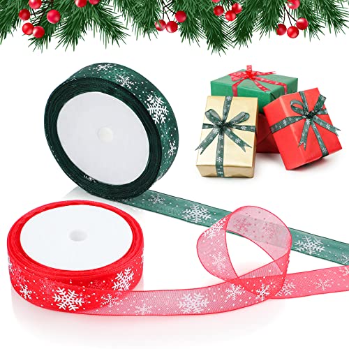 Nastro di Organza 2 Pezzi Nastro Cablato di Natale Nastro di Chiffon Trasparente Rosso Verde, Nastro Natalizio con Fiocchi di Neve Nastro di Neve Trasparente per Artigianato Fai da Te