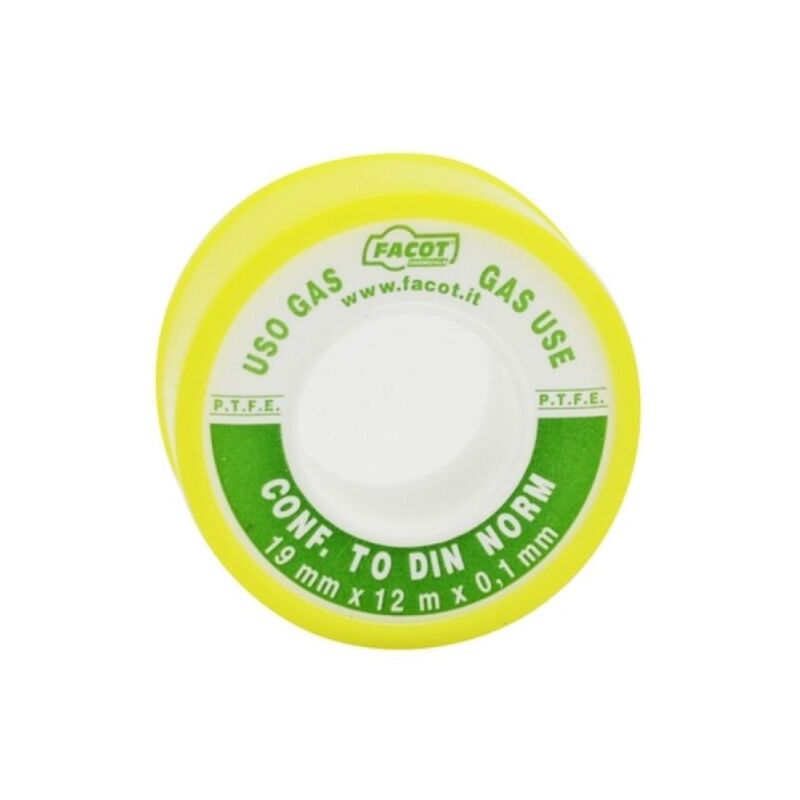 Nastro in P.T.F.E. puro, non sinterizzato, di spessore costante 0,1 mm, conforme alle normative DIN per la sigillatura di filettature di tubazioni convoglianti GAS. Modo d'uso: Applicare su filetti puliti, esercitando una leggere tensione del nastro fino ad ottenere spessori costanti. (DianFlex) H 12 mm x 12 m