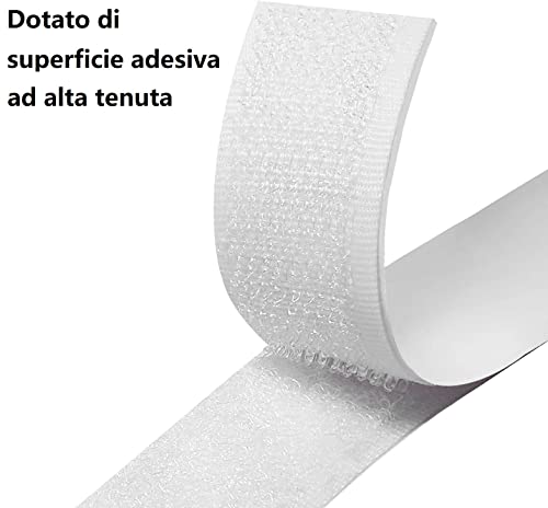 CONTENUTO: 5 metri di nastro a strappo adesivo (1 rotolo maschio + 1 rotolo femmina da 5 metri ciascuno) con larghezza 20 mm colore Bianco.