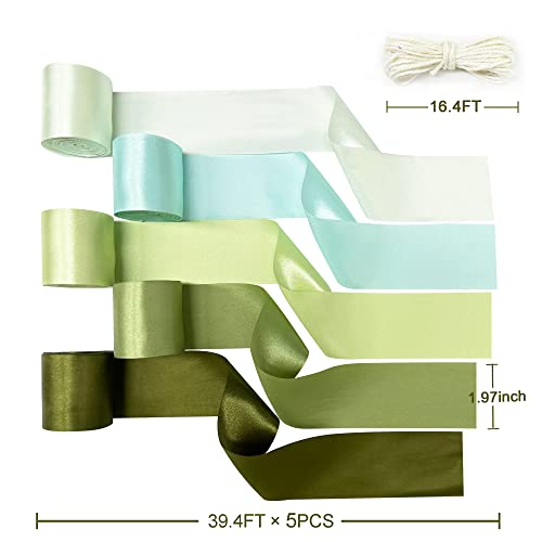 La confezione contiene: il nostro kit di nastri di raso fai da te di colore verde salvia sfumato fatto a mano include 5 colori (verde scuro. Verde salvia. Verde menta. Aqua. verde chiaro). Ogni nastro è lungo 12 m x 50 mm di larghezza. Totale 60 metri. Soddisfare le esigenze generali quotidiane. Viene fornito con uno spago di iuta bianco lungo 5 m per appenderlo.