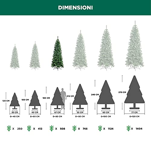 CARATTERISTICHE: I singoli rami lunghi e corti sono stati posizionati alternativamente in modo che l'abete acquisisca naturalezza e risulti pieno in qualsiasi sua parte senza nessun "vuoto". Rametti progettati per essere anticaduta e coprire quasi totalmente la base. Numero di Rami: 510 Altezza Albero: 180 cm, Diametro della base: 80 cm. Lunghezza degli aghi: 2,5 - 5 cm. Lunghezza delle punte del ramo: 15 -20 cm.