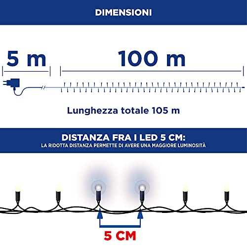 SICURE E CERTIFICATE: Catena luminosa lunga 105 metri e con 2000 Led, ideale per decoro casa, giardino, vetrine e albero di natale. Le nostre luci hanno superato tutti i test internazionali di conformità ottenendo le migliori certificazioni come CE ROHS / CE EMC / CE-LVD / UL 588. Garantiscono quindi un utilizzo più sicuro e costi energetici inferiori in quanto consumano l'80% di energia in meno rispetto alle lampadine tradizionali e hanno una durata superiore a 35.000 ore di utilizzo.