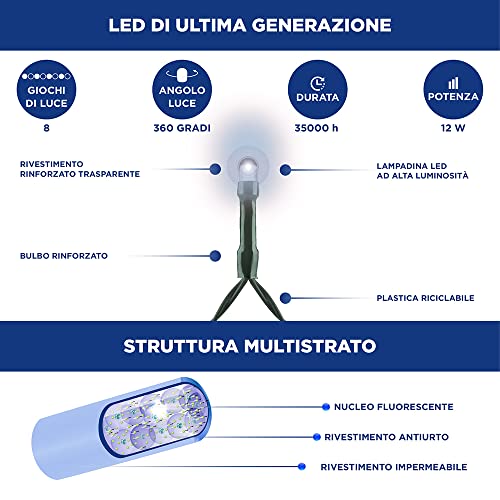 MASSIMA LUMINOSITA': Questa catena di luce garantisce un'ottima luminosità visto che i Led sono alla distanza ravvicinata di 5 cm e sono posizionati in direzione opposta, questo sistema permette così di creare un fascio di luce a spirale come se fosse un grande nastro luminoso.