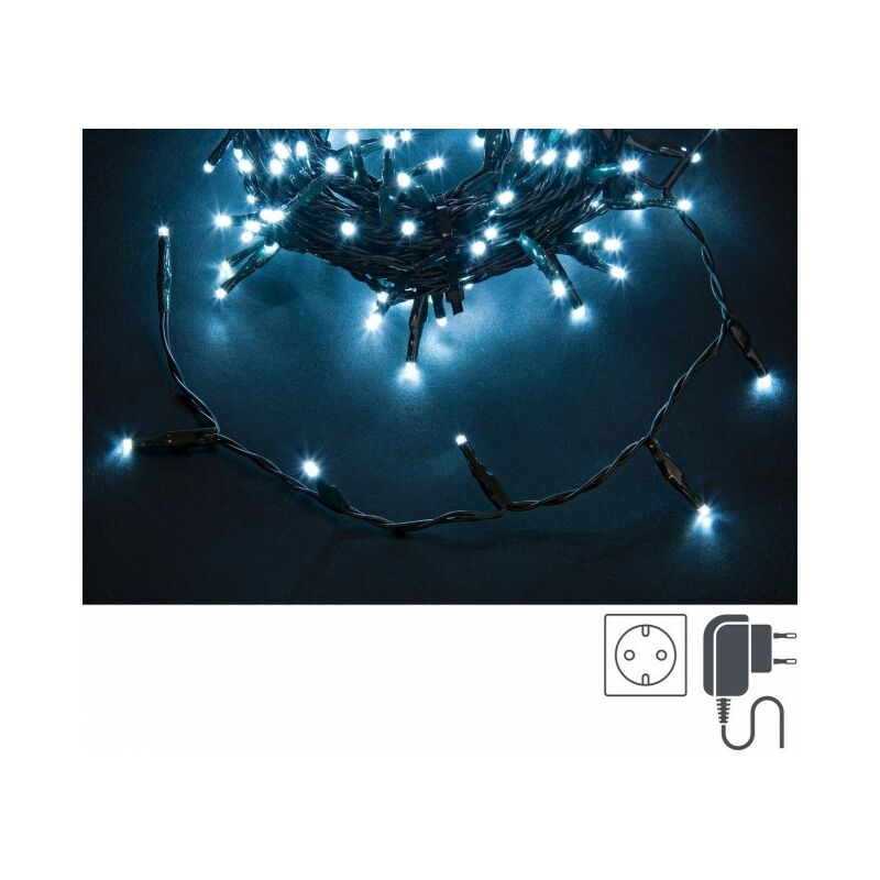 Catena 240led, luce bianca, dimensione led 3mm non sostituibile. filo verde, lunghezza totale filo 14,95mt, lunghezza cavo alimentazione 3mt, lunghezza filo luci 11,95mt. dotato di presa schuko. 8 giochi luce con memory. per uso interno-esterno ip44. con colour box. con trasformatore 31v3.6w.