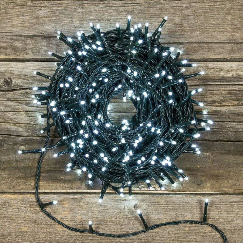I LED sono una sorgente di luce creata da un processo elettronico. i vantaggi derivanti dal loro utilizzo sono: il bassissimo consumo la lunga durata l'elevata ed intensa luminosità La decorazione è fornita di un memory controller EMC con 8 giochi luce ( mantiene in memoria il gioco selezionato anche dopo lo spegnimento e la successiva accensione) Il prodotto è ideale per decorazioni interne ed esterne di alberi di Natale, decorazioni verdi in pvc, balconi, porticati, vetrine, ecc. Specifiche tecniche: Tipo lampade: Led Colore luce: luce Fredda e calda Colore cavo: Verde e Trasparente Uso: Interno / Esterno Voltaggio: 230 Volt Prodotto con marchio CE Trasformatore IP44 per esterno Diametro LED: 5 mm Lunghezza Alimentazione: 4 mt Modello: 77 led Numero led: 77 Lunghezza Totale: 9 mt Lunghezza Filo Luci: 6 mt Modello: 100 led Numero led: 100 Lunghezza Totale: 11 mt Lunghezza Filo Luci: 7 mt Modello: 154 led Numero led: 154 Lunghezza Totale: 14 mt Lunghezza Filo Luci: 10 mt Modello: 300