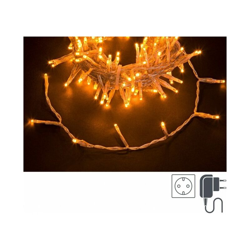 Catena 180led, luce calda, dimensione led 3mm non sostituibile. filo trasparente, lunghezza totale filo 11,95mt, lunghezza cavo alimentazione 3mt, lunghezza filo luci 8,95mt. dotato di presa schuko. 8 giochi luce con memory. per uso interno-esterno ip44. con colour box. con trasformatore 31v3.6w.