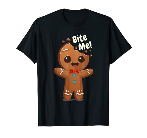 Christmas Gingerbread Man Bite Me Tshirt Regali per Natale fa grandi regali per i bambini. Ideale calza stuffer o camicia pigiama natalizio.